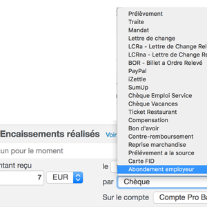 - Enregistrés avec comme partie du moyen de paiement "Abondement employeur" : ce type de paiement est disponible dans les liste de modes de réglement.