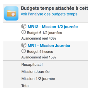 Dans le bloc de raccourcis de chaque affaire un lien "Voir l'analyse des budgets temps", vous permet d'accéder à un tableaux d'analyse :