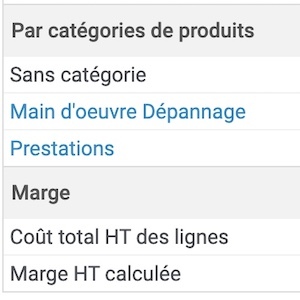 L'affichage des statistiques se fait dans le bloc des totaux en bas à droite de vos documents (sur l'écran, pas sur le PDF). A chaque ajour, modification, suppression des lignes, les statistiques sont recalculées.