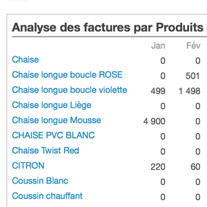 Ce tableau d'analyse de vos ventes par produits détaille les montants et les quantités de produits par mois (CA) pour chacun de vos produits ou catégorie de produits. Vous pouvez également exporter ce tableau.