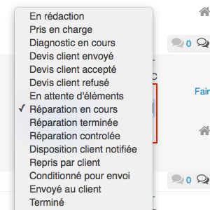 Pour suivre votre réparation, de la prise en charge du produit à réparer jusqu'au retour client, des statuts spécifiques de la pièce sont proposés :