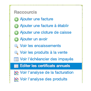 L'activation de l'app ajoute un nouveau menu "Editer les certificats annuels", dans le bloc de raccourcis du menu "factures"