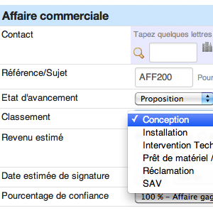 L'activation de l'App "Classement des affaires", ajoute un nouveau champ "Classement" sur vos affaires, avec un menu déroulant reprenant vos classes, pour sélectionner l'état de qualification de votre affaire.