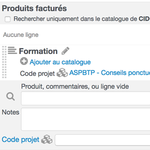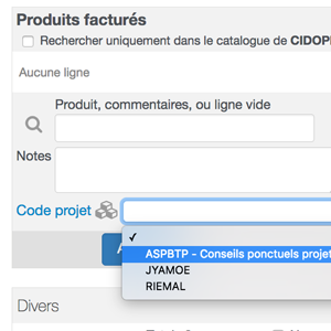 - Un nouveau champ sur les lignes de produits des documents commerciaux de type facture et facture d'achats, pour permettre la sélection et l' affichage "sur chaque ligne de produits" d'un code projet
