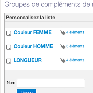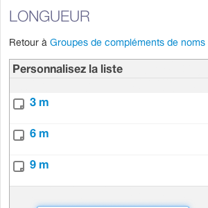 Créez un groupe "Longueur" et saisissez les intitulés: 3 m ; 6 m ; 9 m ; 12 m ;