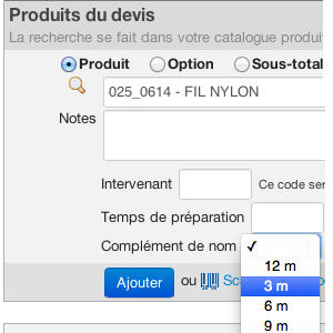 La liste des intitulés correspondant au groupe de complément de nom sélectionné sur la fiche du produit sera ensuite proposée à la sélection dans les devis.