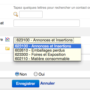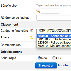 Cette liste de comptes vous sera ensuite proposée sur vos achats. Lors de l'ajout d'un nouvel achat, dans le champ "catégories financières", vous pourrez sélectionner et rattacher le compte comptable correspondant à votre dépense.