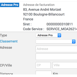 - Le Siret et le code service de l'étabissement : cette information est à saisir au niveau de l'adresse pour permettre de personnaliser les éléments en fonction de l'adresse de l'établissement facturé