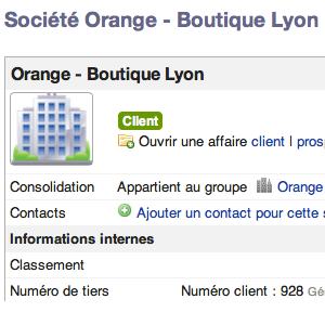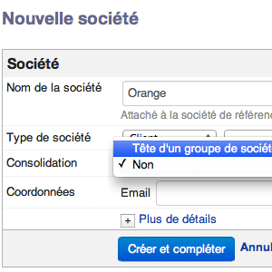 • Pour lier une société à sa maison-mère, c'est également dans le champ "consolidation". Le menu contient les "Têtes de groupes" que vous avez préalablement définies.