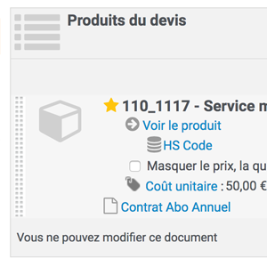 Dans le bloc d'ajout des "produits" d'un document commercial, pour lequel vous avez activé la fonction, vous disposez, sur chaque ligne de produit, d'un nouveau champ "contrats".