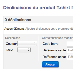 La page qui s'affiche permet alors de créer vos déclinaisons d'articles, en fonction des groupes et attributs que vous avez créés.