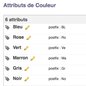 Exemple d'attributs, pour le groupe "couleur" : jaune, rouge, bleu, vert, etc.