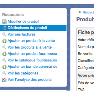 Pour ajouter une déclinaison, rendez-vous sur votre fiche produit, et cliquez sur le lien "Ajouter les déclinaisons" présent dans le bloc de raccourcis de la fiche.