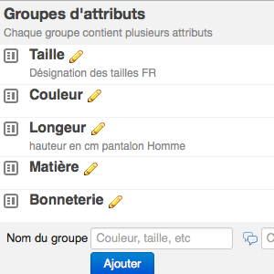 - Créer des groupes de déclinaisons (couleurs, tailles, millésime, intensité, etc)