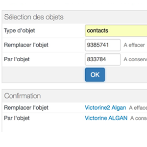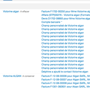 - Les informations de type notes, fichiers, tâches, devis, factures etc. présents sur l'objet à effacer sont transférées sur l'objet à conserver