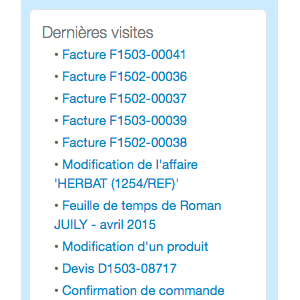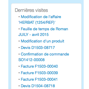 Ce bloc vous offre un lien direct vers les objets (devis, facture, BL, bons de commandes, contacts, congés, feuille de temps, note de frais, etc.) que vous avez récemment :