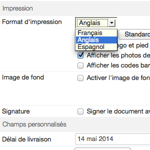 Un nouveau paramétrage du format d'impression s'ajoute, pour vous permettre de désigner la langue du document qui sera utilisée lors de l'envoi par mail ou l'impression PDF.
