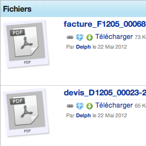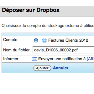 - Manuel : ce réglage vous permet de choisir des dossiers Dropbox sur lesquels vous pourrez déposer en un clic les fichiers de votre choix. Parfait pour partager des documents avec des clients. Une petite icone Dropbox sera affichée à côté de chaque fichier de votre application en ligne. Cliquez dessus pour choisir le dossier Manuel sur lequel déposer le fichier.