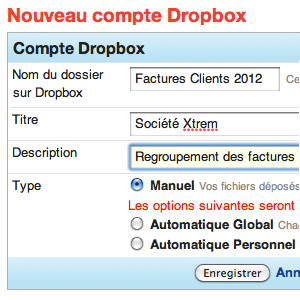 - Manuel : ce réglage vous permet de choisir des dossiers Dropbox sur lesquels vous pourrez déposer en un clic les fichiers de votre choix. Parfait pour partager des documents avec des clients. Une petite icone Dropbox sera affichée à côté de chaque fichier de votre application en ligne. Cliquez dessus pour choisir le dossier Manuel sur lequel déposer le fichier.