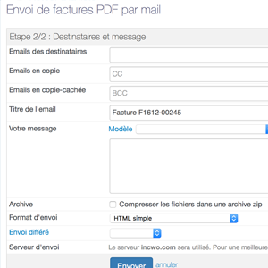 L'activation de l'app ajoute sur la fonction d'envoi de devis et factures, un nouveau champ : "Envoi différé" contenant un menu déroulant qui vous permet de planifier l'envoi de vos messages clients.