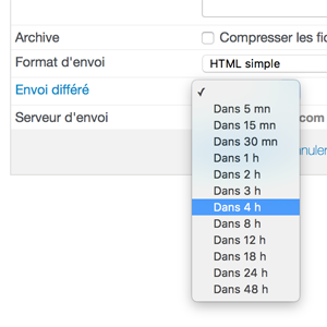 Dans l'étape 2/2 d'envoi, rendez-vous dans le champ "Envoi différé" et sélectionnez le délai d'envoi de votre message.