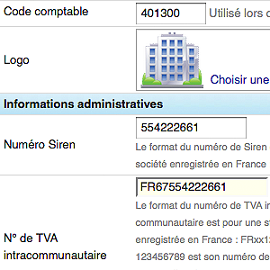 Exemple : si la classe comptable de votre produit, définie avec votre expert-comptable, est le 708000 par exemple, complétez ce numéro dans le champ "code comptable". De même pour un client, s'il entre dans la classe comptable 411000, inscrivez ce numéro dans le champ "code comptable. Si c'est un fournisseur, vous pourrez indiquer le numéro 401000.