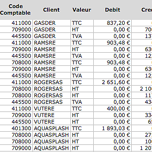 Paramétrez vos codes comptables sur vos tiers (clients,fournisseurs), produits et TVA, comptes de charges, comptes bancaires, et exportez les écritures correspondant à votre facturation et vos achats, au format comptable, tel un journal, en version cvs ou excel.