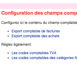 Pour cela, cliquez sur le lien "export" présent en haut de chaque page. Dans le bloc de raccourcis de cette page, cliquez sur le lien "Config des champs comptables".