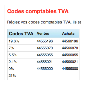 Sur la nouvelle page qui s'affiche, cliquez sur le lien "Les codes comptable de TVA", pour paramétrer vos comptes de TVA. Le Tableau de TVA, liste l'ensemble des valeurs de TVA utilisée dans l'application. Vous pouvez définir votre TVA à la vente et votre TVA liée aux achats.