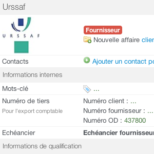 - sur les fiches contacts/sociétés (client, fournisseur et collaborateur) un nouveau champ : "Numéro OD " qui vous permet de définir le compte comptable du tiers utilisé pour les exports d'OD. Le code comptable du salarié est également à saisir sur sa fiche contact et non sur sa fiche de registre du personnel.