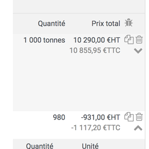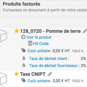 - Une ligne de produit, nommée Taxe CNIPT, qui calcule la valeur de la cotisation, en fonction des quantités de produits commercialisés