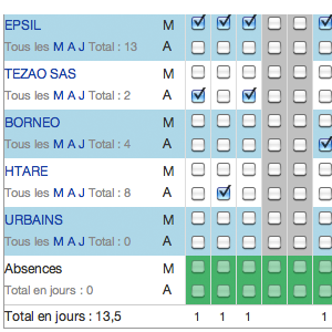 - Réaliser une saisie mensuelle rapide, sur une affaire en cliquant sur la lettre M (matin) A (après midi) ou J (journée) présente à droite du nom de l'affaire, pour affecter en un clic, toutes les Matinées, toutes les Après-midi ou les Jours entiers du mois.