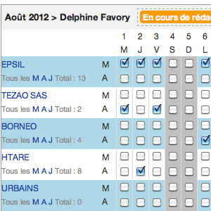 Saisissez rapidement les temps par affaire, via une grille, proposant un système de case à cocher, par demie-journée, et des raccourcis pour affecter, en un clic, une période sur une même affaire.
