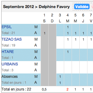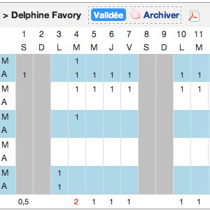 La grille mensuelle de feuilles de temps présente une ligne "absences". Elle affiche les jours de congés validés du collaborateur, et les jours non-travaillés enregistrés dans l'application depuis le module "journée non travaillées".