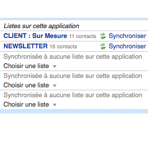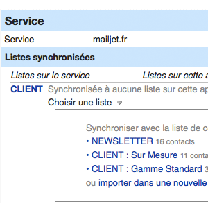 - Cliquez sur "régler" : vos listes des contacts présentes sur le service Mailjet s'affichent dans la partie "listes synchonisées"