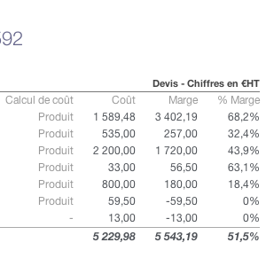 Avec l'app "Marge commerciale par article", indiquez le coût de vos articles lors de l'ajout dans un devis ou une facture et obtenez un calcul de marge.