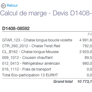 Avec l'app "Marge commerciale par article", indiquez le coût de vos articles lors de l'ajout dans un devis ou une facture et obtenez un calcul de marge.