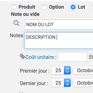 Pour désigner et ajouter un nouveau lot sur un devis ou une facture, dans le bloc produits du document :