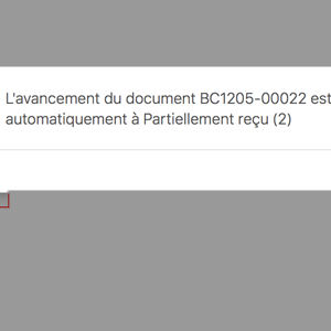 - Si au moins une ligne d'article a un statut "partiellement reçu" ou "reçu", alors le statut consolidé du bon de commande fournisseur passe en "partiellement reçu". Une fenêtre d'information vous informer de l'actualisation de ce statut de la pièce commerciale.