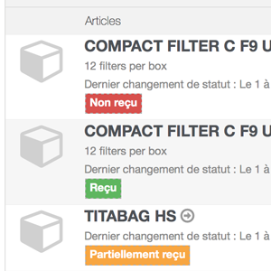 Indiquez pour chaque article d'une commande si il est reçu de manière complète ou partielle, ou pas du tout. Vous connaissez ainsi à tout moment l'état de réception de chacune de vos marchandises et faites évoluer automatiquement le suivi de l'avancement de votre commande.