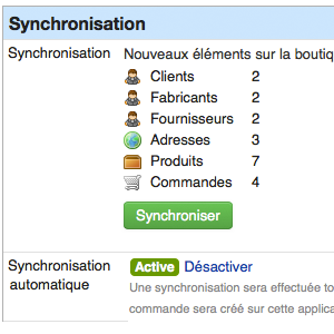 La page affiche alors la liste de nouveaux éléments de votre boutique à synchroniser : contacts clients, contacts fournisseurs, produits, commandes … Lancez la synchronisation pour ajouter les éléments dans votre Bureau Virtuel, en cliquant sur "Synchroniser".