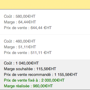 Retrouvez lors de chaque ajout de ligne l'impact sur la marge du produit fini, mais aussi le tarif recommandé.