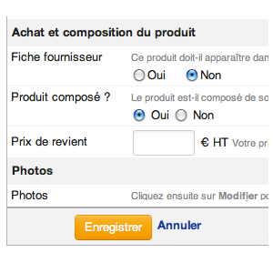En cochant "oui" dans le champ "produit composé", après validation du formulaire produit, un nouveau bloc "Composition du produit" s'affiche pour vous permettre de composer votre produit et d'ajouter ses sous-produits.