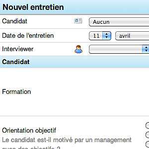 – "Entretiens" : pour saisir les comptes-rendus de vos entretiens, afin de pouvoir comparer des critères qualitatifs et quantitatifs pour chaque candidat, qu’il s’agisse d’un poste ou d’un stage.