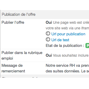 Pour ce champ, si la sélection est "OUI", l'application déclenche, à la validation de l'offre d'emploi, la création d'un lien web associé à l'offre d'emploi créée.
