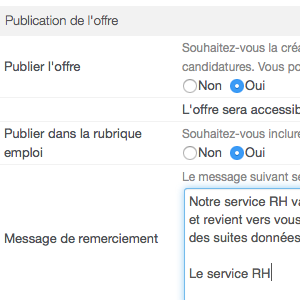 - Saisir un "Message de remerciement", qui sera visible par les candidats qui auront postulés sur votre site