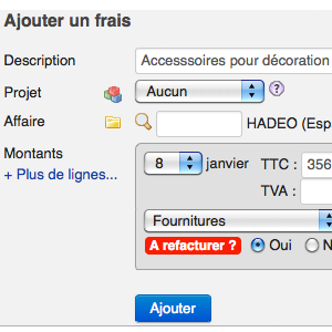 - Lors de la saisie de frais sur une note de frais : un champ "A refacturer" pour désigner par oui ou non, si le frais est à refacturer. En marquant "oui", il vous sera alors proposé de le facturer à votre client.