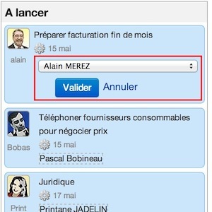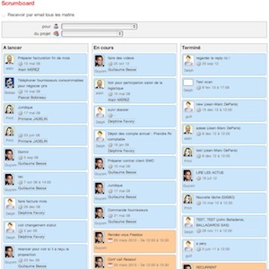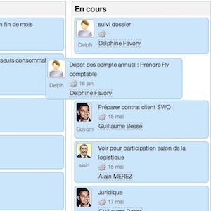 • En cours : contient les tâches que vous êtes de train de réaliser, et les événements et rendez-vous du jour. Faites glisser une tâche de A programmer à En cours pour la lancer. Le panneau En cours contient ainsi les tâches que votre équipe est en train de réaliser plus les rendez-vous du jour. Vous obtenez donc une vue synthétique du travail en cours dans votre entreprise.