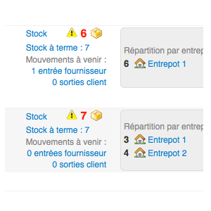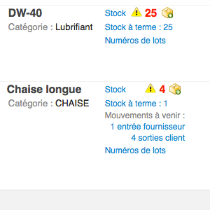 - Dispose d'un lien cliquable pour visualiser le détail des stocks relatifs aux commandes à venir : celles des clients acceptées indiquées par le terme "X sorties clients" et celles des fournisseurs en cours indiquées par le terme "Y entrées fournisseurs"