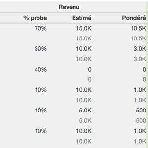 - Revenu estimé : % de confiance / Revenu Estimé / Revenu Pondéré